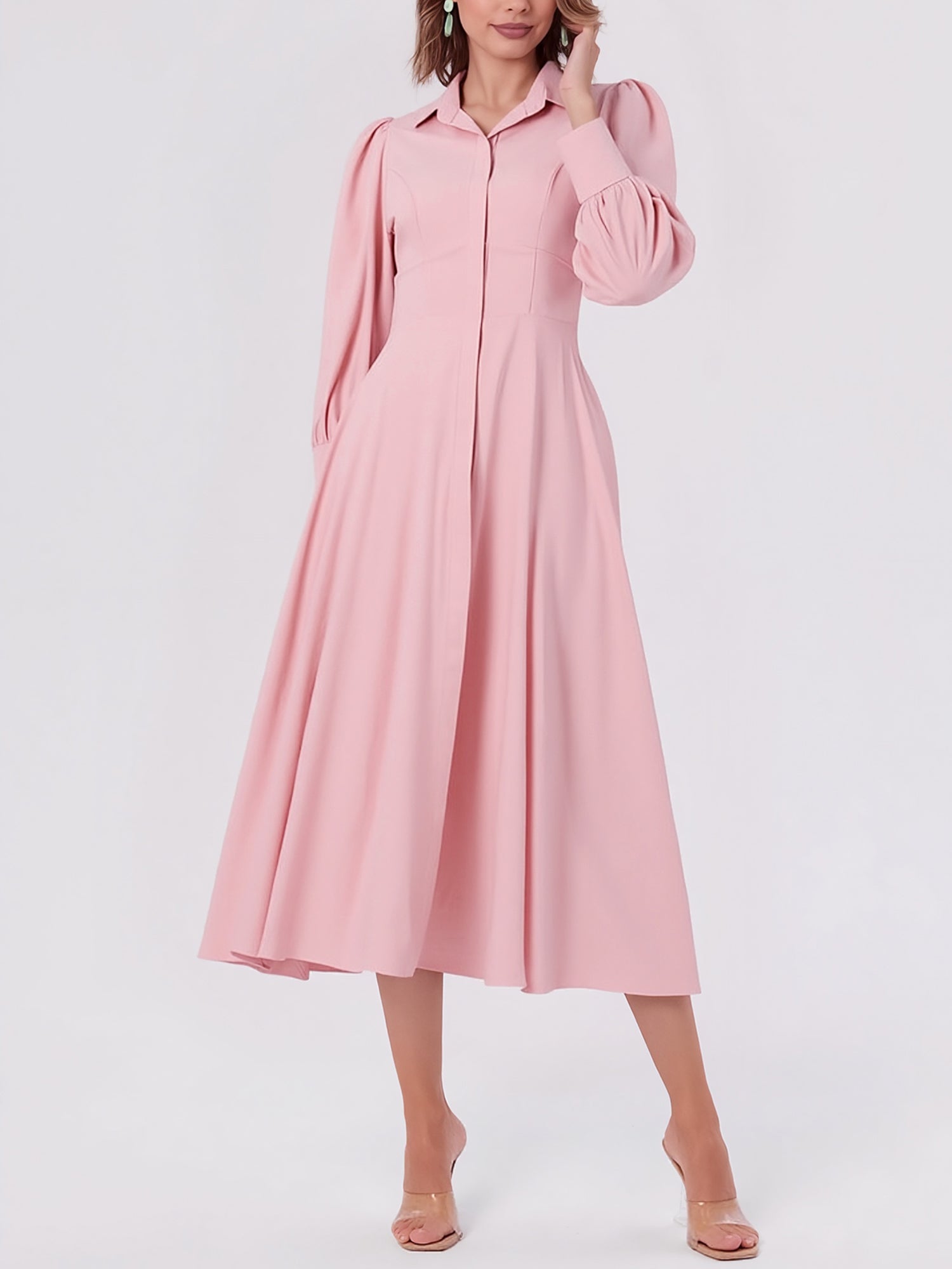 Solid Color Puff Long Sleeves Midi A-Line Shirt Dress